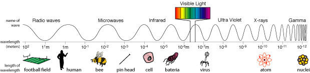 Our eyes can only detect light with wavelengths from about 390 nanometers to 700 nanometers. This range is called visible light and is shown as a rainbow in the NASA image below. But, satellites can detect a much wider range of wavelengths, depending on the sensor. Landsat satellites detect light from visible blue (450 nm)  to the thermal infrared (1251 nm).ems_length_final